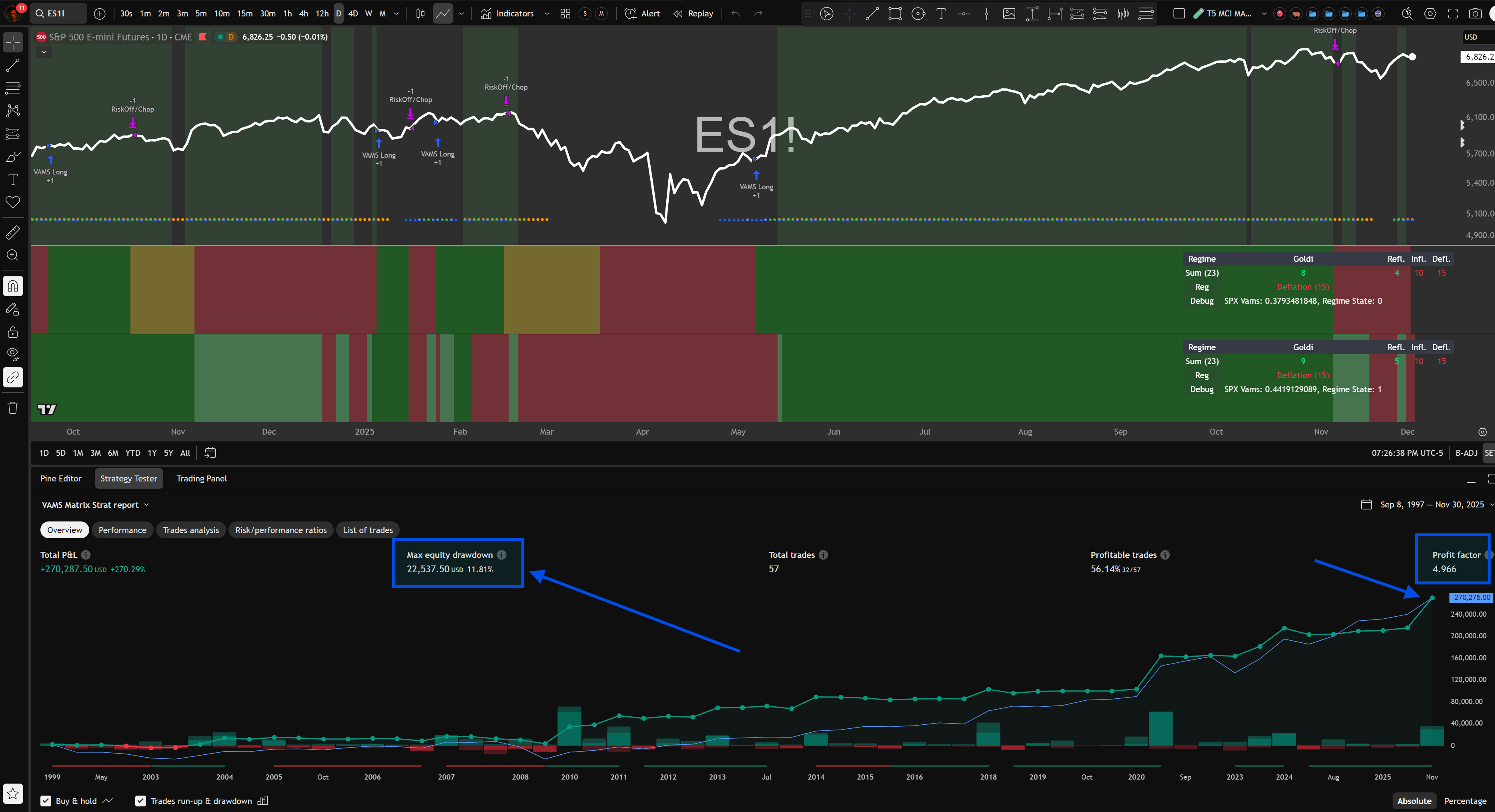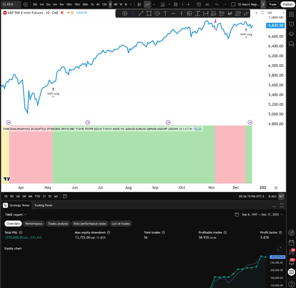 Backtested on ES1! futures from August 1999 through March 2026.
