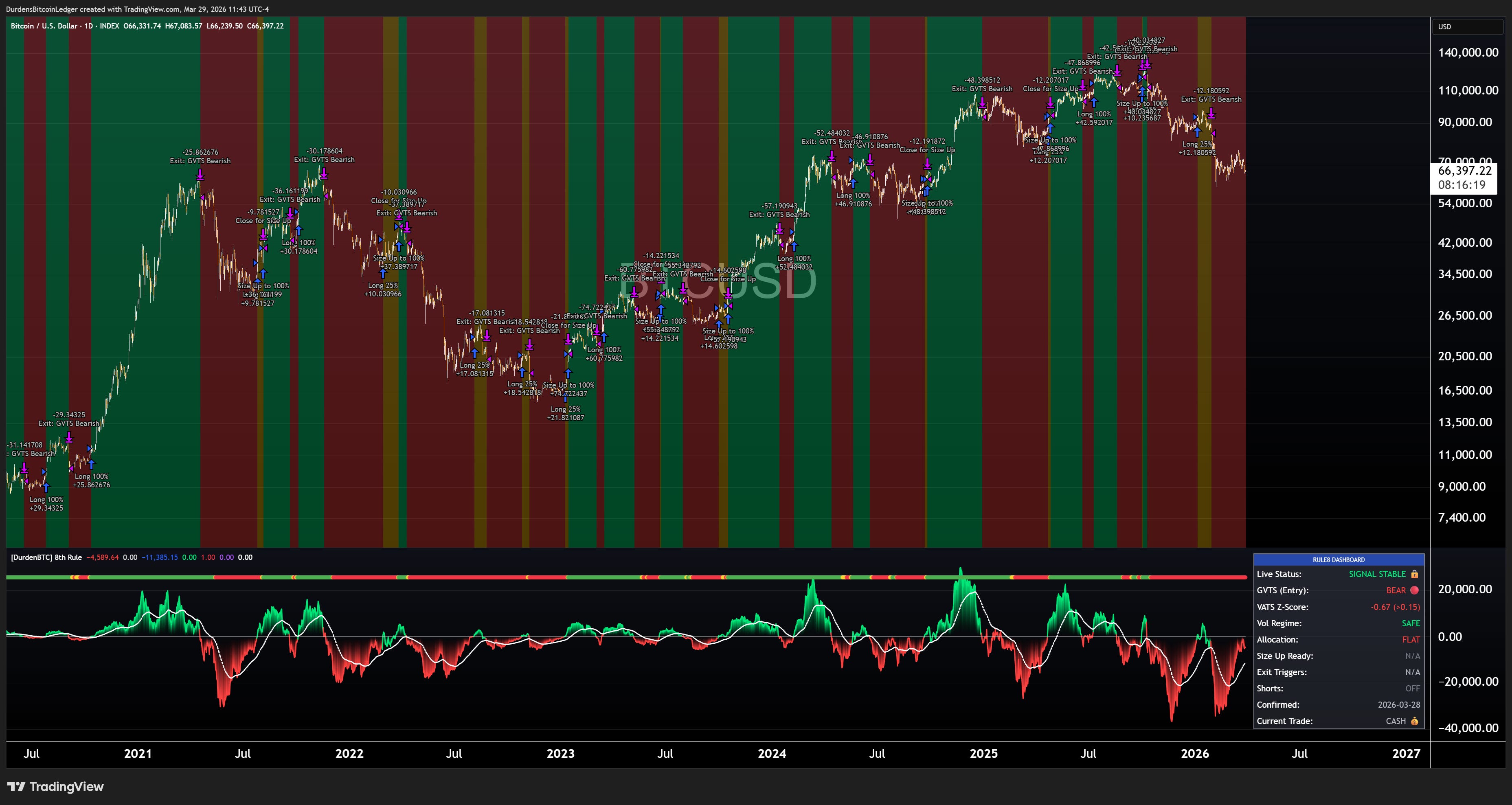 For Bitcoin & GLD 0.00%↑ (Gold) , I built a separate engine: The 8th Rule.. a dual-speed Gaussian volatility trend system. Where the MRE polls 20+ global assets, The 8th Rule runs two independent signal engines at different speeds on the underlying asset itself.