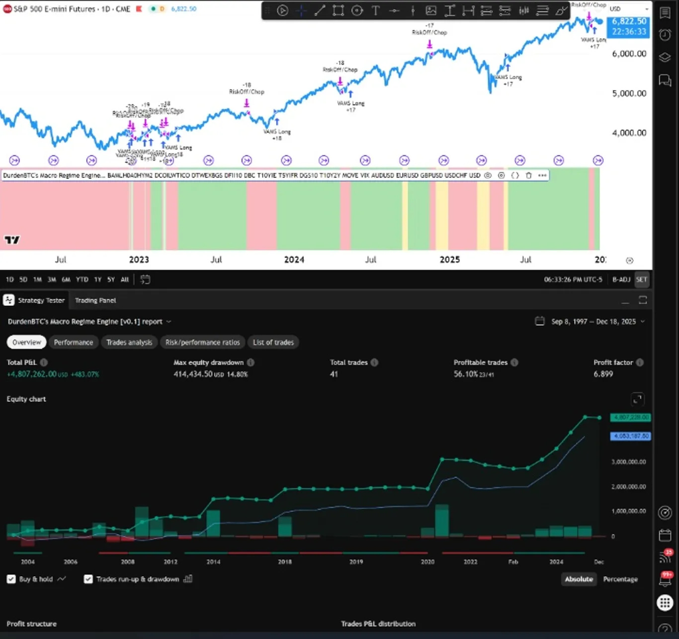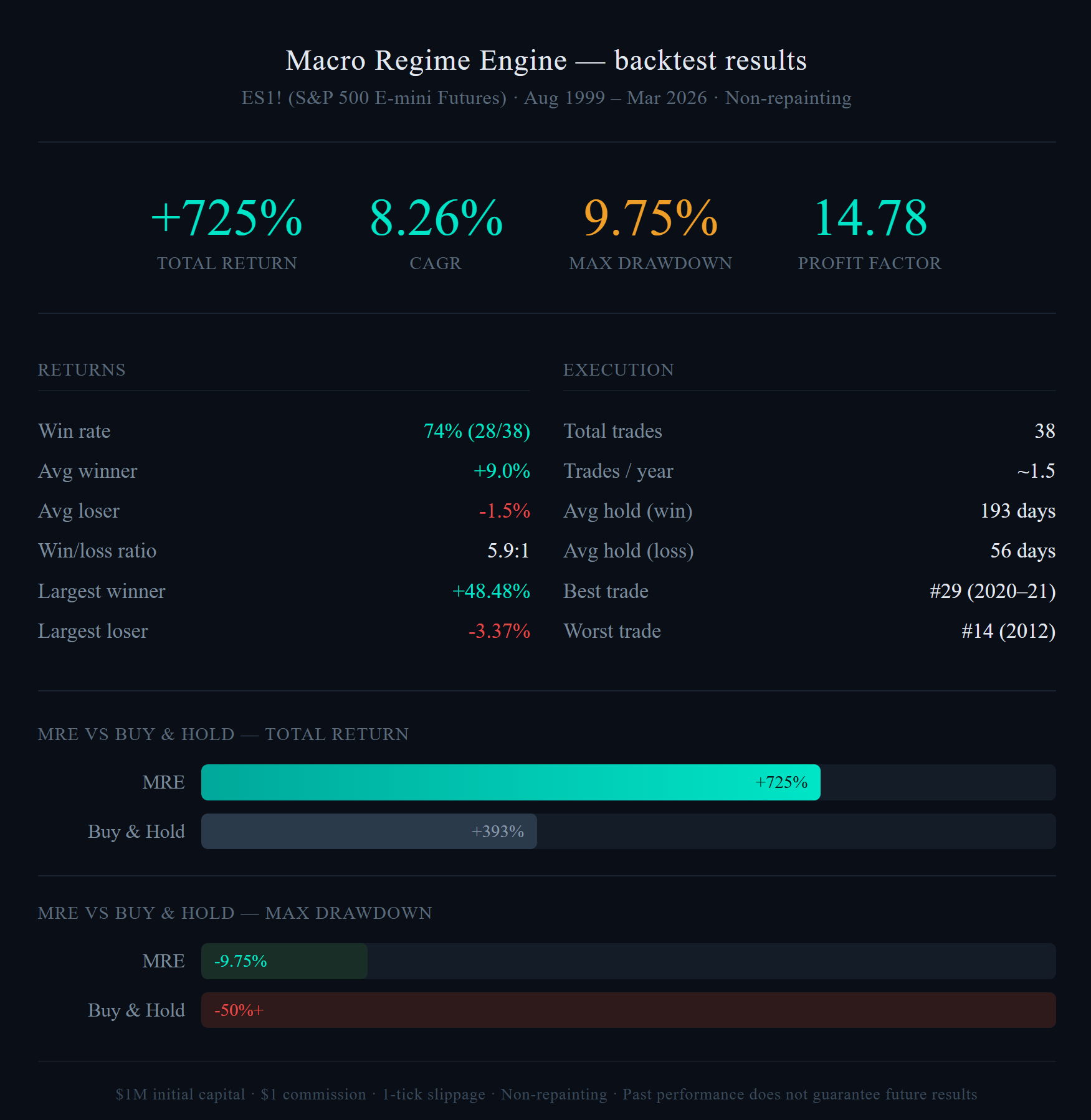 Last updated: March 2026. All performance figures re-audited against TradingView backtest export on CME E-mini S&P 500 futures (ES1!) from August 1999 through March 2026. $1M initial capital, $1 commission, 1-tick slippage. Non-repainting.