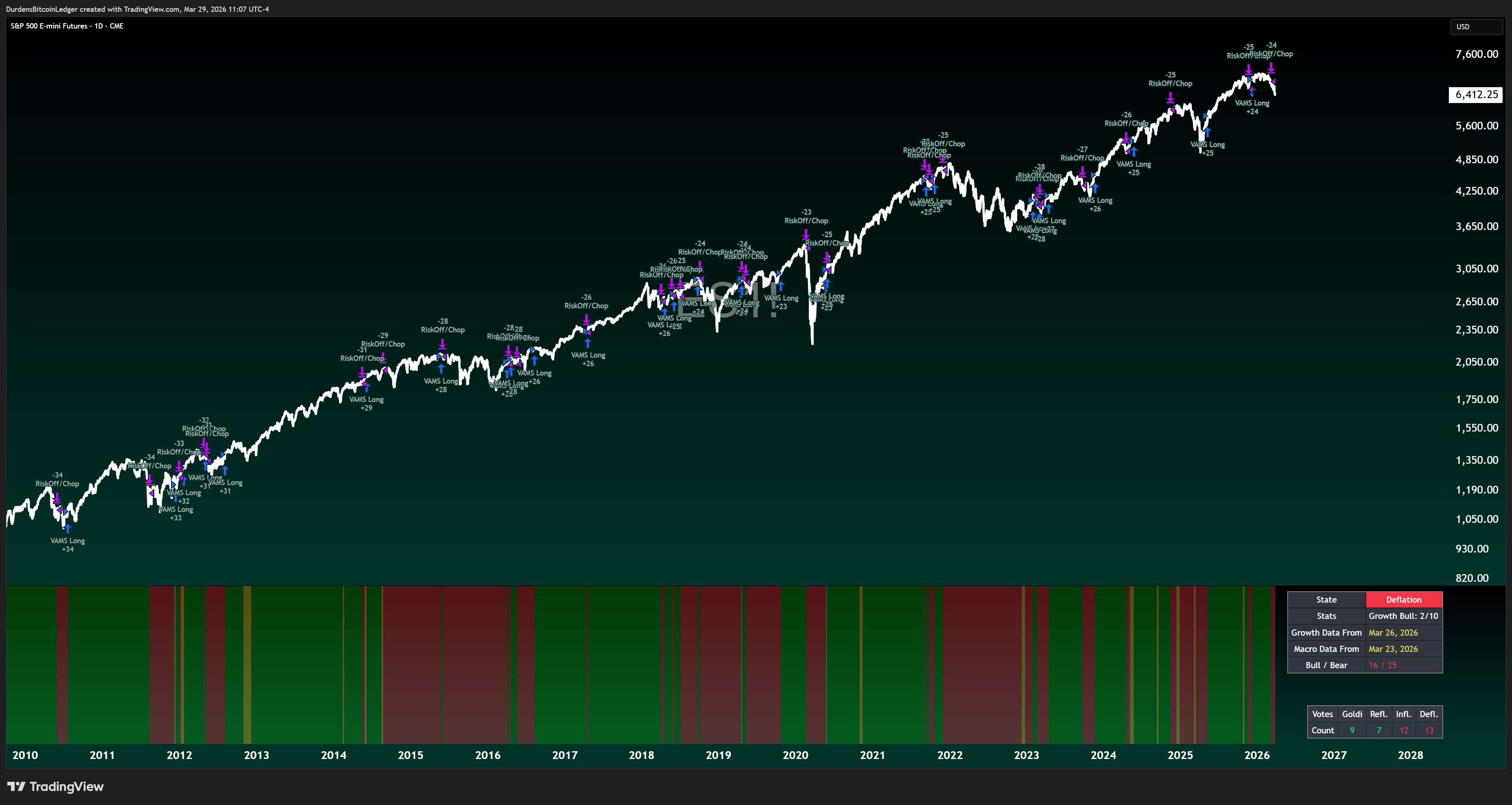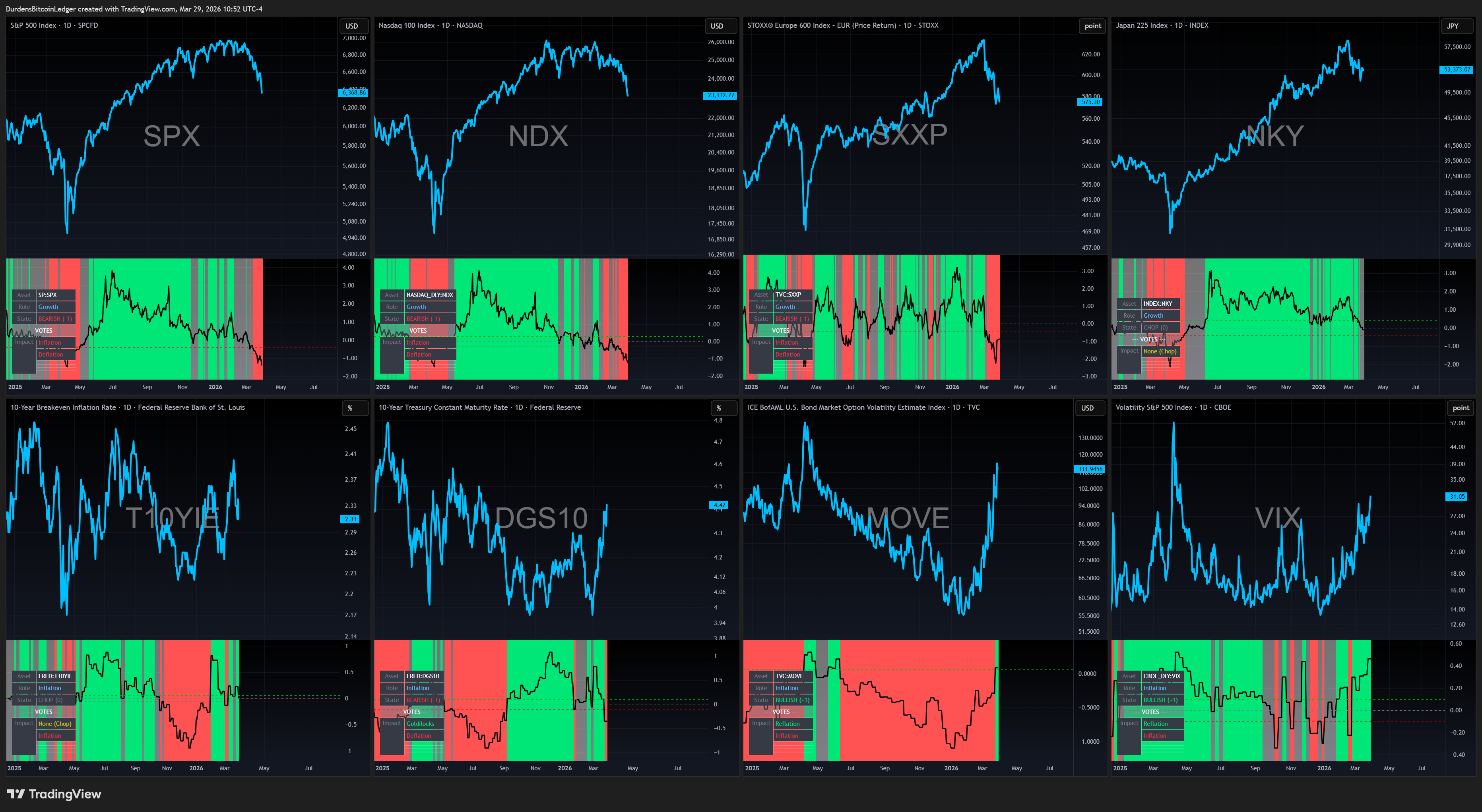 Growth / Risk: SPX, Nasdaq, Russell, EuroStoxx, Nikkei, Bitcoin, high yield credit spreads, growth FX. When these go bullish, they vote for Goldilocks and Reflation. When they puke, they vote for Inflation and Deflation.