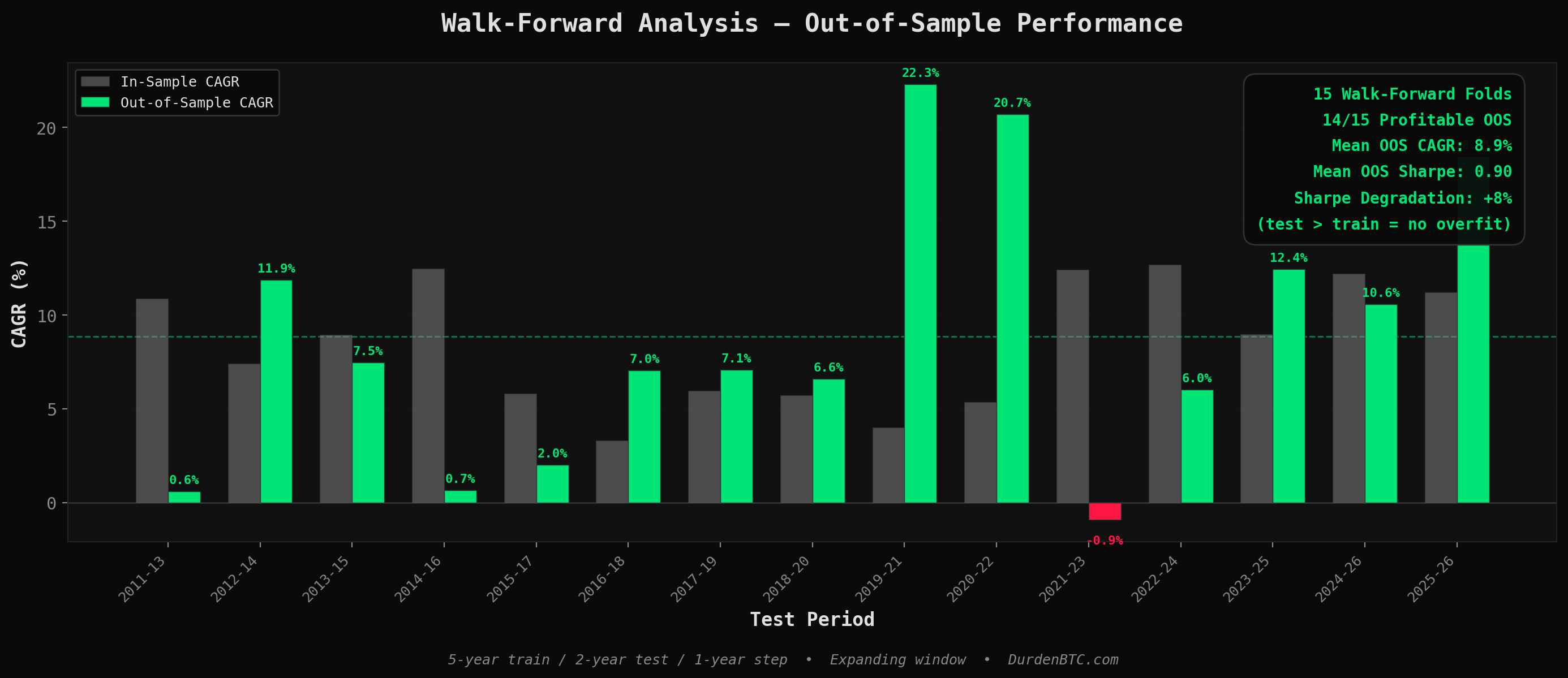15-fold walk-forward analysis (expanding window, 5yr train, 2yr test): 14 of 15 folds profitable out-of-sample. Mean OOS CAGR of 8.9% with a 0.90 Sharpe.. actually higher than in-sample. Zero overfitting signal.