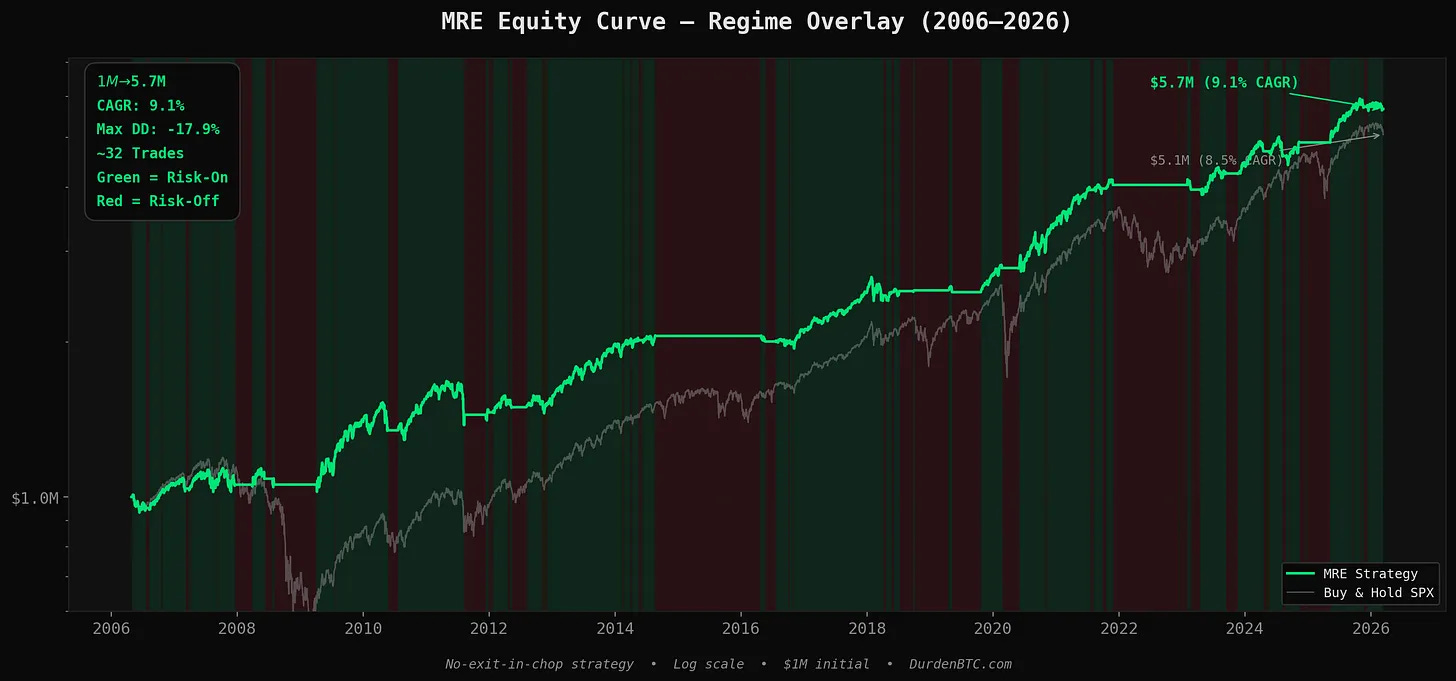 No shorts. No hedging. No complex position management. This is not a “short every bear market” engine. It’s a “don’t be long when the house is on fire“ engine.